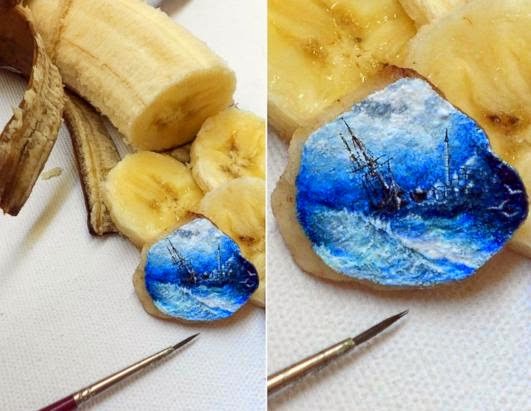 Но как, например, ему удается сохранить свой маленький шедевр на срезе кусочка банана??? Чем он закрепляет работу и как обрабатывает поверхность банана ДО того?