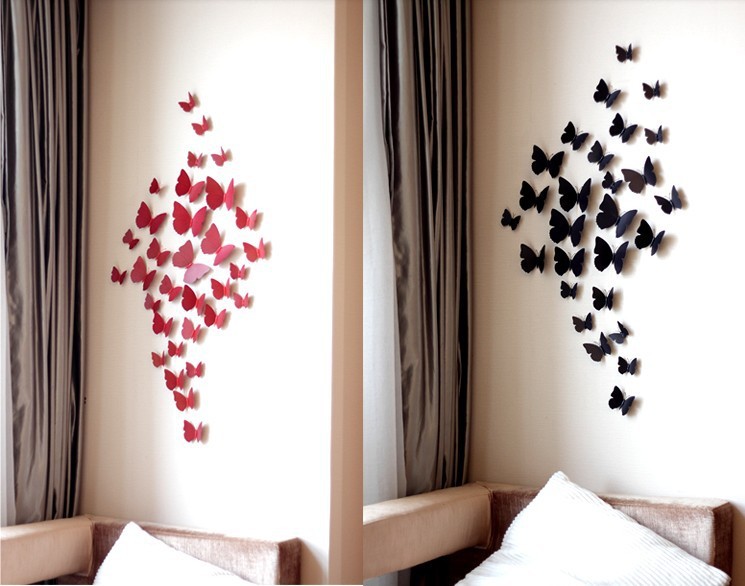 Такие украшения для комнаты своими руками делаются легко, необходимо будет только запастись терпением на вырезание многочисленных бабочек, ну а клеить рой на стену уже намного быстрее. Если отогнуть у каждой бабочки крылышки, а композицию составить с плавным переходом между цветами радуги, со стороны это будет очень эффектно смотреться.