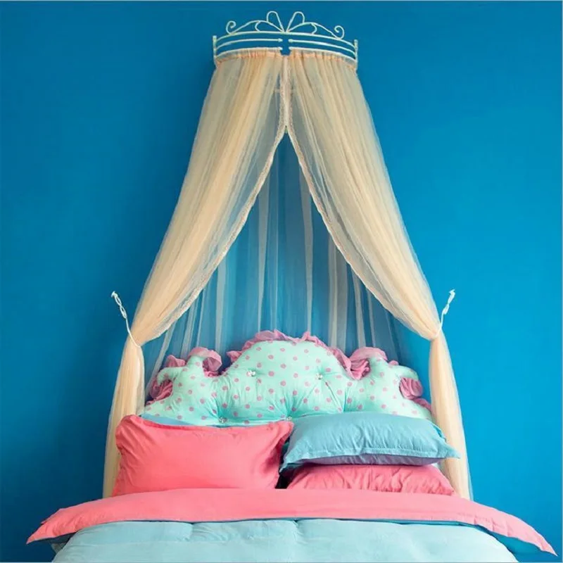Балдахин в форме купола, пожалуй, самый тяжелый для фиксации. Он крепится на кронштейн, который еще нужно аккуратно вмонтировать в потолок. Чаще всего такой вариант балдахина используется в детской комнате, но бывают и варианты крепления у взрослых.