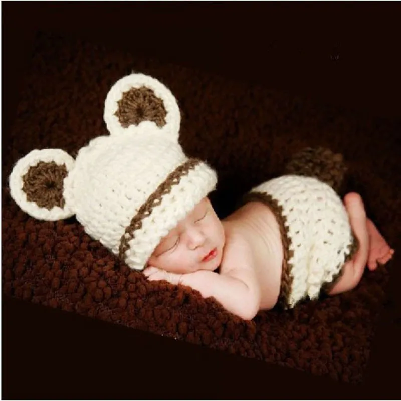 Пребывание в уютном вязаном гнездышке дает малышу ощущение спокойствия и безопасности, а художнику возможность получить великолепные кадры. В дополнение к кокону можно подобрать веселую шапочку или повязку. - Вязаные костюмы . Забавные головные уборы с заячьими ушками или маленькими рожками в одно мгновение преобразят кроху. Оригинальные образы смешного кролика, овечки, зеленого лягушонка или потешного жирафика — замечательная идея для первой фотосессии. Они помогут создать интересные сказочные сценки, и даже целые истории основным участником которых станет маленькая модель. Фотографии получатся более эффектными, если позаботиться о дополнительном реквизите, например яркой морковке для зайчика, искусственных цветах или мягком одеяльце. Такие кадры можно иллюстрировать забавными надписями, которые выражают мысли и соответствуют мимике ребенка.