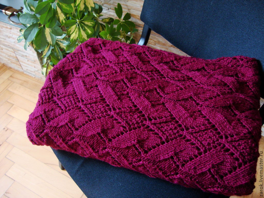 Очень мягкий и теплый плед спицами выполнен двойными косами