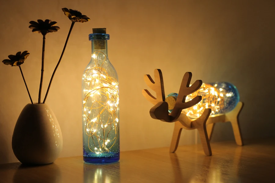 - настольные лампы. Здесь бутылка служит основанием. Ее можно декорировать чем угодно. Модель с размещенной внутри гирляндой, может служить прекрасным элементом декора детской комнаты. Если украсить изделие кованными элементами, заполнить кофейными зернами, бобовыми, это будет отличный вариант для спальни.