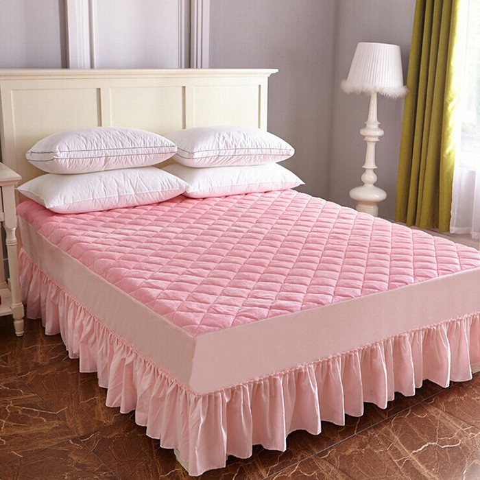 - Делают оборку в складку либо слегка присобирают ткань. Обрабатывают край покрывала в загиб. Альтернатива — обработка косой бейкой, бахромой, кружевом, тесьмой.